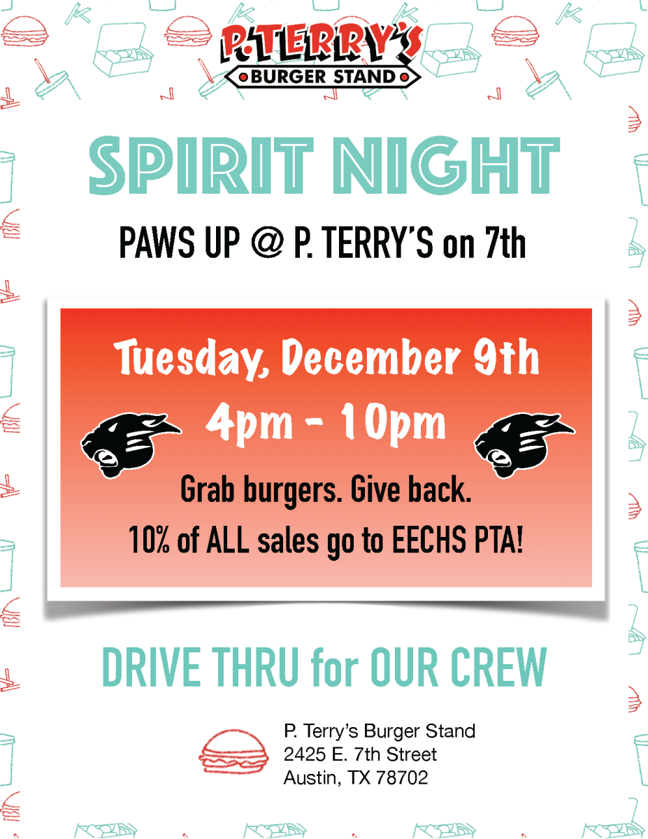 Drive thru for our crew! Grab dinner from P. Terry's on East 7th Street on December 9th from 4:00 PM - 10:00 PM. 10% of all purchases will go to the Eastside ECHS PTSA.